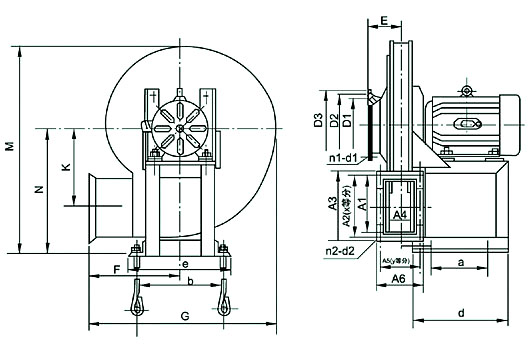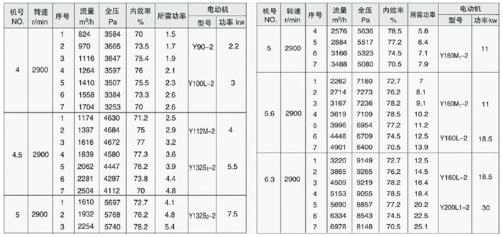 本風機為單吸入式。機座號有NO.4#、4.5#,5#、5.6#、6.3#共五個機號,因版面有限6.3;以上風機的參數不在說明書中出現,敬請諒解。本風機可做成左右旋轉,出風口位置角度可按用戶需要而定,風機的傳動方式為A式和D式兩種。
